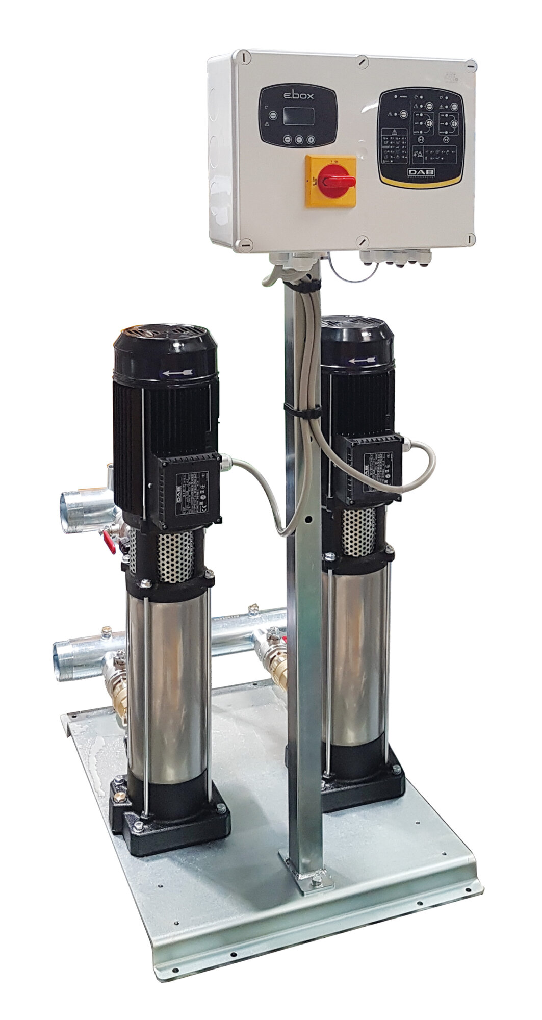 Automatické tlakové stanice 2 KV se 2 vertikálními vícestupňovými čerpadly KV se sacím a výtlačným potrubím, jednou tlakovou nádobou a ochranou motoru proti přetížení.