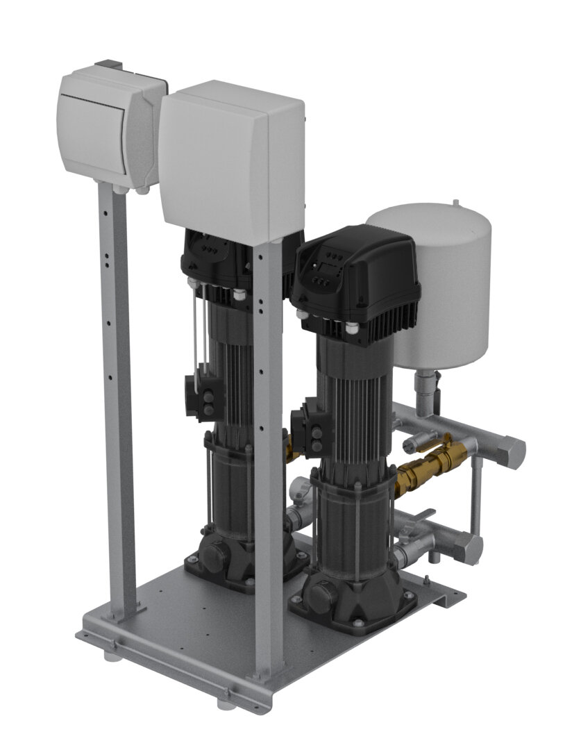 Automatická tlaková stanice se 2 nebo 3 čerpadly KVCX s MCE-P frekvenčním měničem kmitočtu otáček pro každé čerpadlo. Automatické tlakové stanice jsou navrženy pro zvýšení tlaku v komerčních budovách nebo zemědělství a zavlažování. Kompaktní rozměry díky použití vertikálních čerpadel. Včetně 1 tlakové nádoby pro stanici. Základna z pozinkovaného plechu s antivibračními pryžovými podložkami. Vstupní a výstupní potrubí z galvanizované oceli. Součástí jsou zpětné ventily pro každé čerpadlo.