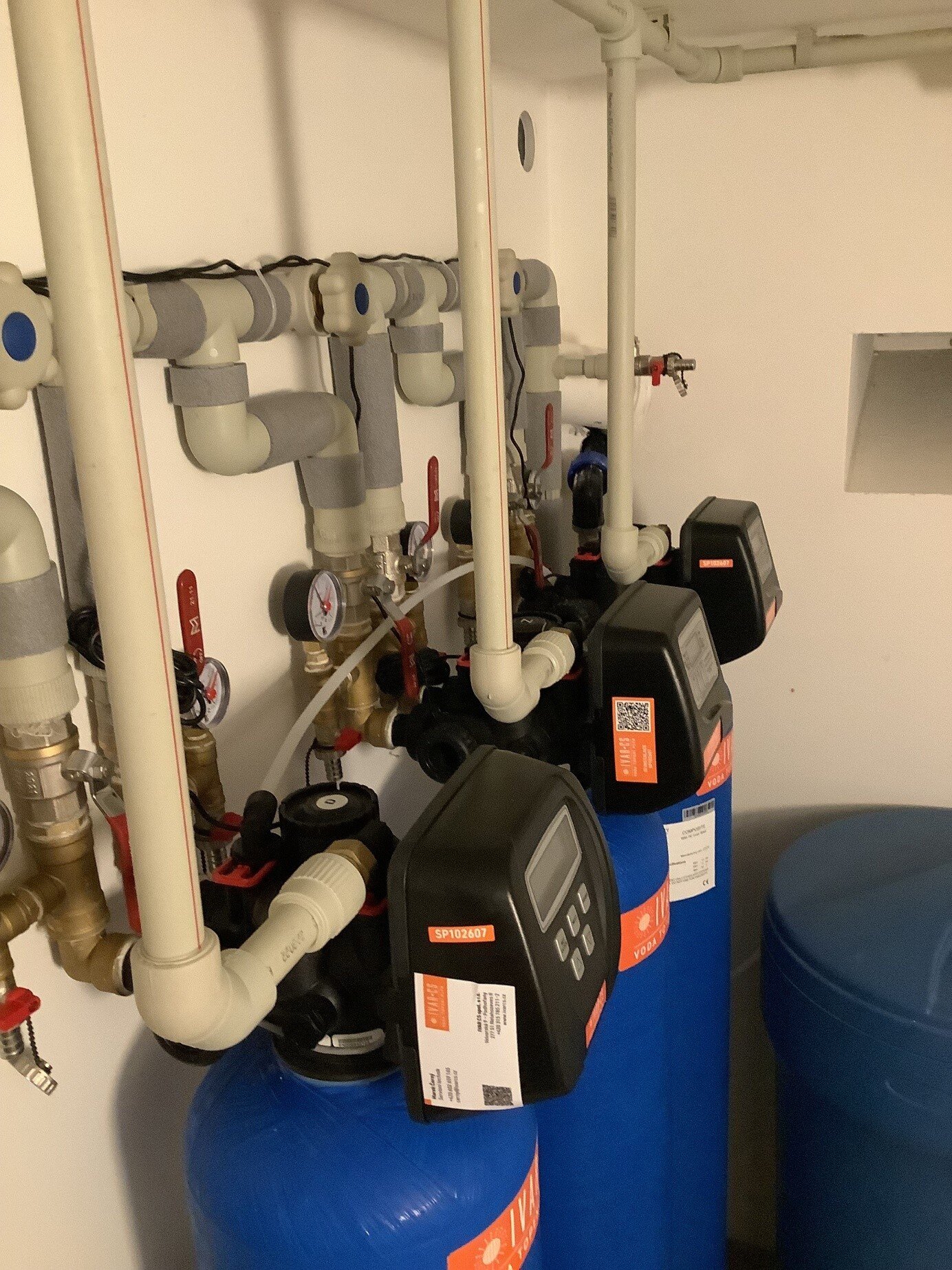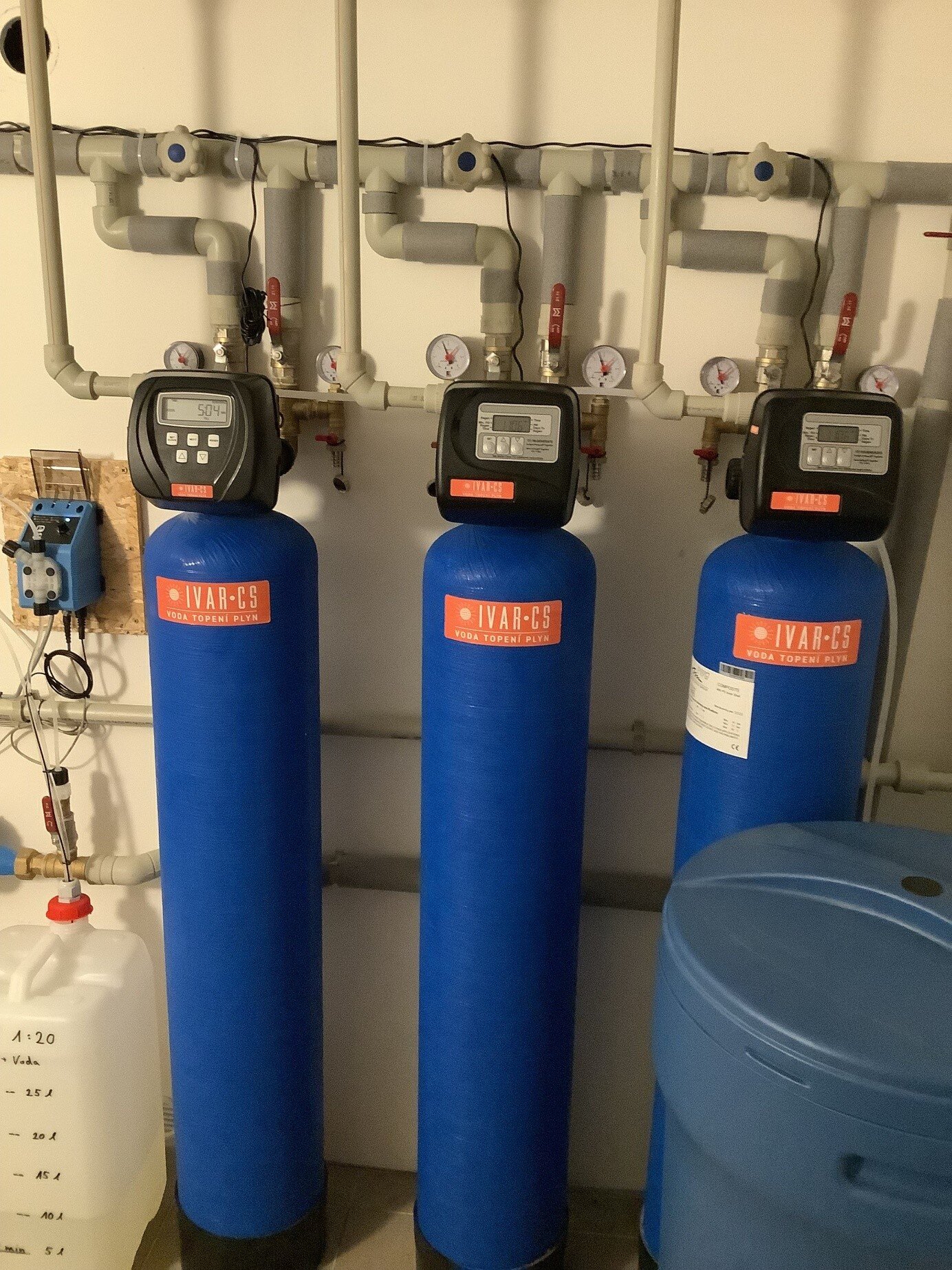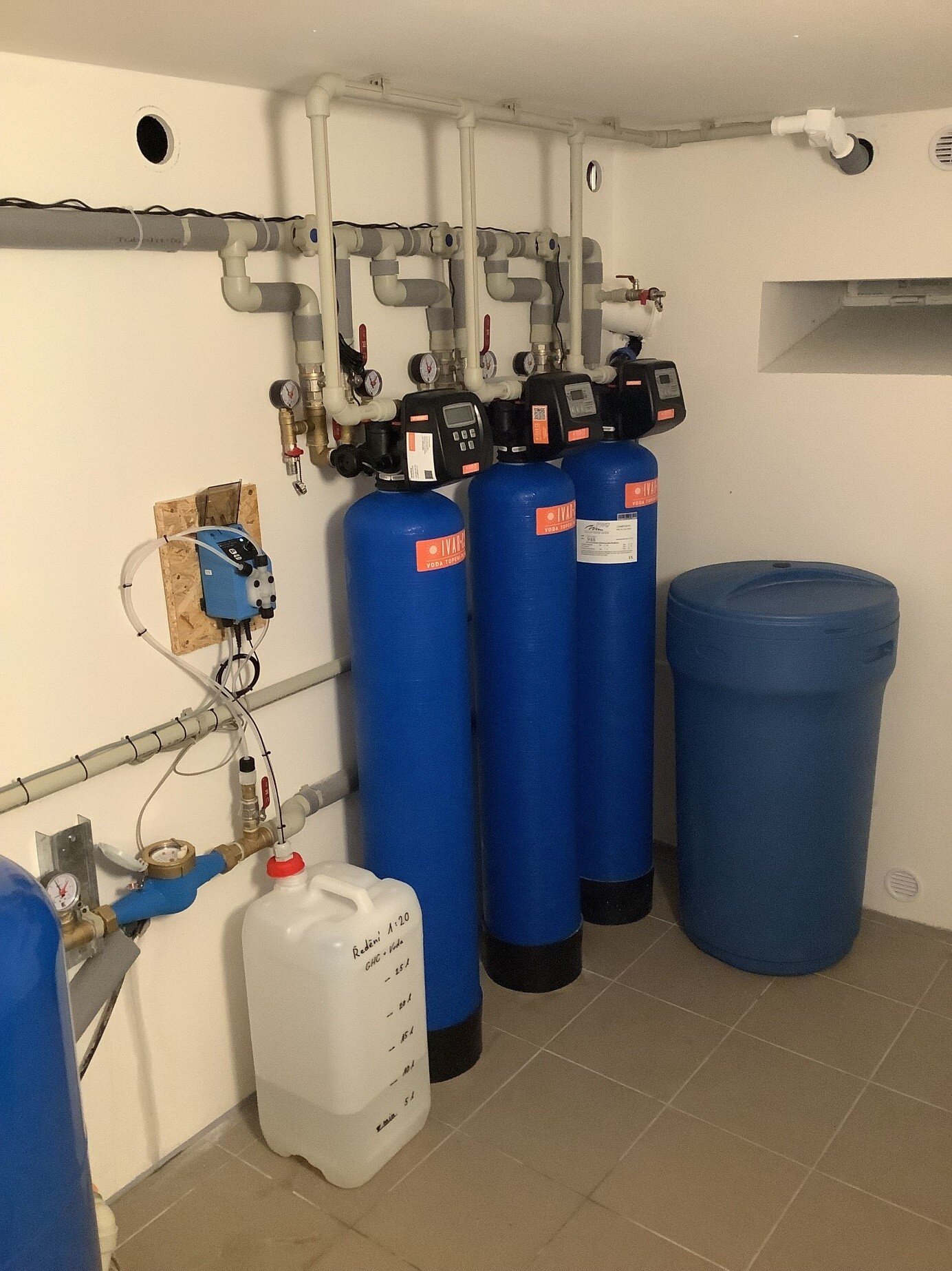 Použitý materiál: vícevrství sloupcový předfiltr IVAR.DESAND 045, sloupcový filtr pro odstranění železa, manganu IVAR.DEFEMN 045, změkčovací sloupový filtr IVAR.DEVAP 045, dávkovací čerpadlo GEL.DOSAMATIC PPI X5M řízené impulzním vodoměrem GEL.IVLI. DRY
